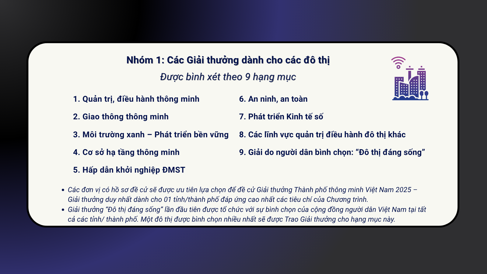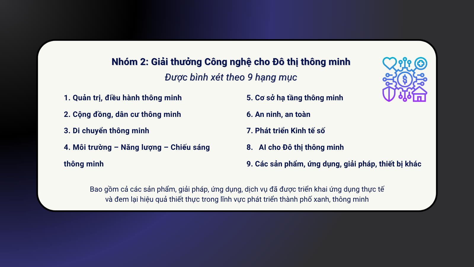 Nhóm 1: Dành cho đô thị 2 cấp thuộc 34 các tỉnh, thành phố trực thuộc Trung ương. Nhóm 2: Dành cho các sản phẩm, ứng dụng, giải pháp, trang thiết bị công nghệ số xanh cho các lĩnh vực hoạt động của các thành phố, đô thị.